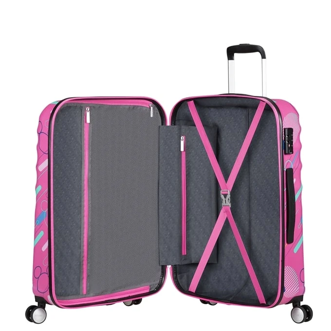 Deze vrolijke Wavebreaker Disney Spinner 67 van American Tourister is een middenmaat koffer en geschikt voor een weekje vakantie. De koffer is voorzien van een gaaf design en een ruim interieur. Het ruime hoofdcompartiment is voorzien van gekruiste inpakriemen en daarnaast beschikt de koffer over een tussenschot met ritsvak.Inhoud is dankzij het TSA-cijferslot perfect beschermd. De verstelbare trekstang en de vier soepele wieltjes zorgen ervoor dat de koffer prettig te vervoeren is.