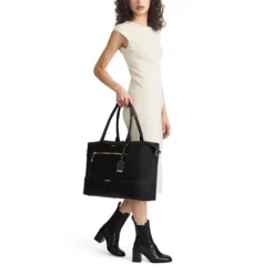 De Arrivé Compact 4 Wheel Briefcase van Tumi is compact, stijlvol én praktisch. De koffer is voorzien van een stijlvol design met lederen details. Het interieur is voorzien van een 15” laptopvak en verschillende organisatievakken. Dit geeft opbergruimte voor een laptop, A4-formaat documenten en kleine eigendommen, zoals visitekaartjes. Dankzij de pakriemen in het hoofdcompartiment, is kleding ook in de koffer op te bergen. Een comfortabel leren handvat, vier soepele wielen, een smart sleeve en een meertrapse trekstang zorgen voor extra draagcomfort.